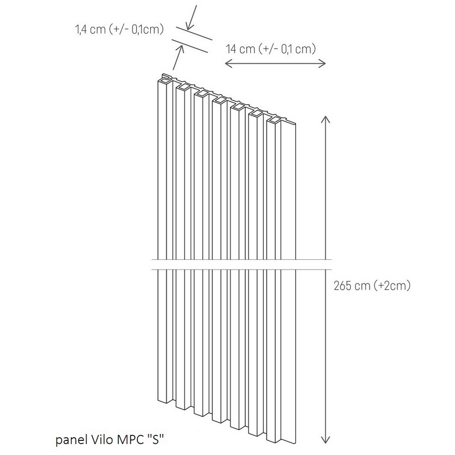 Skladebné rozměry lamelového panelu S jsou 14 cm x 2,65 m, tloušťka panelu je 14 mm.